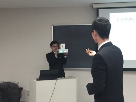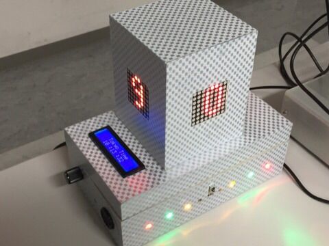 留学生の呉君が製作した立体化LED看板のプロトタイプです。LED看板は4面から見ることができ、それぞれ表示内容を変えることができます。表示部には、8×8ドットマトリクスLEDを使用しています。