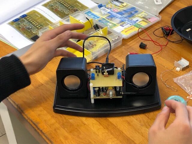 電子工作実習で1年生が製作中のミニオーディオセットです。
