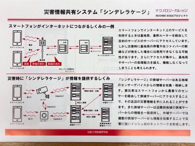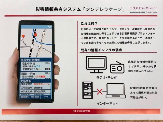 大きな災害が発生したとき、通信インフラの障害による情報の遅れや途絶が問題になります。そのようなとき、混乱した医療現場や避難所から援助に関する情報を送信し、適切な支援を受けるための情報共有システムを提案しました。