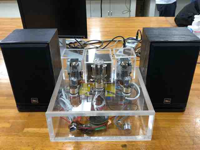 留学生の林さんが製作中の真空管ステレオアンプ。
