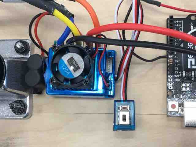 スケボー初心者の上村さん、取り敢えず、ブラシレスモーターを取り付けて、ESC(モータースピードコントローラー)を仮留めしました。