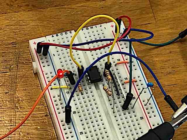 この回路をDIPタイプのICを使って、ブレッドボード上に製作します。