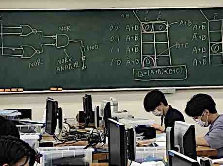 先週まで、加法標準形による組み合わせ回路の設計手順について、NAND_IC(74HC00)を用いて実習を行いました。
