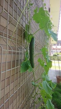 スマートハウスでは壁面緑化実習用にキュウリを