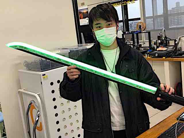 ライトスティックをビッグにしたような日本刀を模した装置です。ブレードの部分に仕込んだフルカラーLEDテープにより、いろいろな色に変化させることができます。