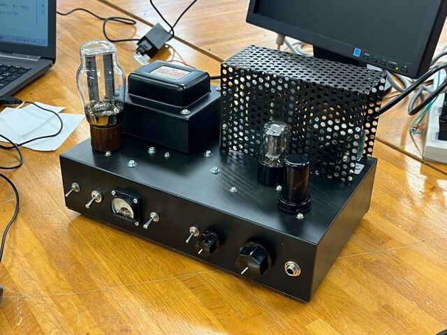 今年は久しぶりに管球式アンプがお目見えです。傍らに置かれた回路図には随所に試行錯誤の痕が残されつつも、丁寧に仕上げられたそのフォルムは初めて手掛けた作品とは思えないほどの上質な出来栄えです。自ら塗装を施した艶消しブラックのシャーシにメタリックのトグルスイッチ類がひと際目を引きます。アンプに電源が投じられると管球類に仄かな明かりが灯り、優しく照らし出されたメータなどとも相まって、これから奏でられるであろう音楽に対し一層期待感が高まります。